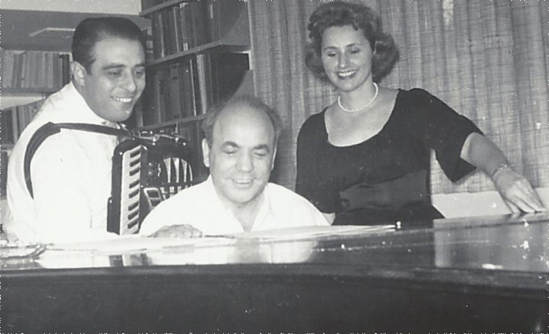 | Carmen Carrozza, Paul Creston, and Elsie Bennett examining the manuscript of the Prelude and Dance. Bennett home and Bennett School of Music, Empire Blvd., Brooklyn New York, October 2, 1957. Bennett AAA commissioned composers personal photo album (unpublished). |